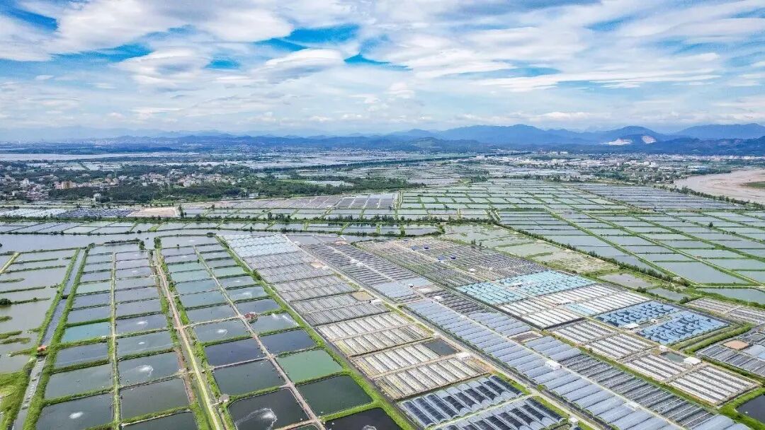 广西防城港东兴市江平镇鱼塘纵横交错,与蓝天白云、村舍相互形成一幅乡村振兴图。
