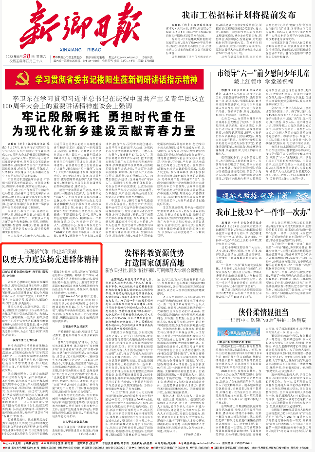 省委书记楼阳生近期在我市调研时强调,要在弘扬先进群体精神上展现新气象。发挥新乡先进群体的示范引领作用,结合正在开展的“能力作风建设年”活动,引导广大党员干部向先进看齐、向先进学习,提升能力、锻造作风、实干立身、争先出彩。